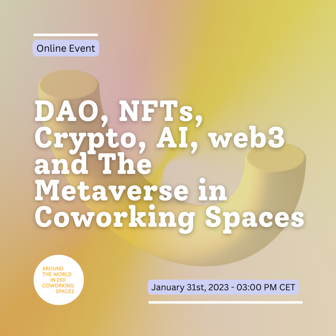 Before you go, don’t forget to book your ticket to our monthly online event, happening on January 31st. This month, we’ll be exploring how the metaverse, web3, DAOs, NFTs, AI, Blockchain, and Cryptos are impacting coworking spaces. Come learn with us!